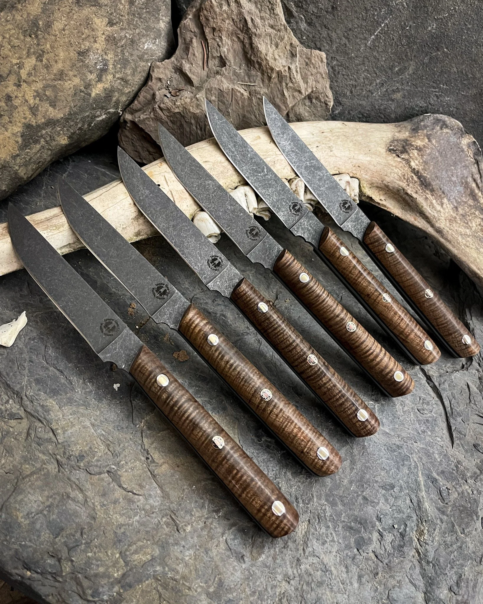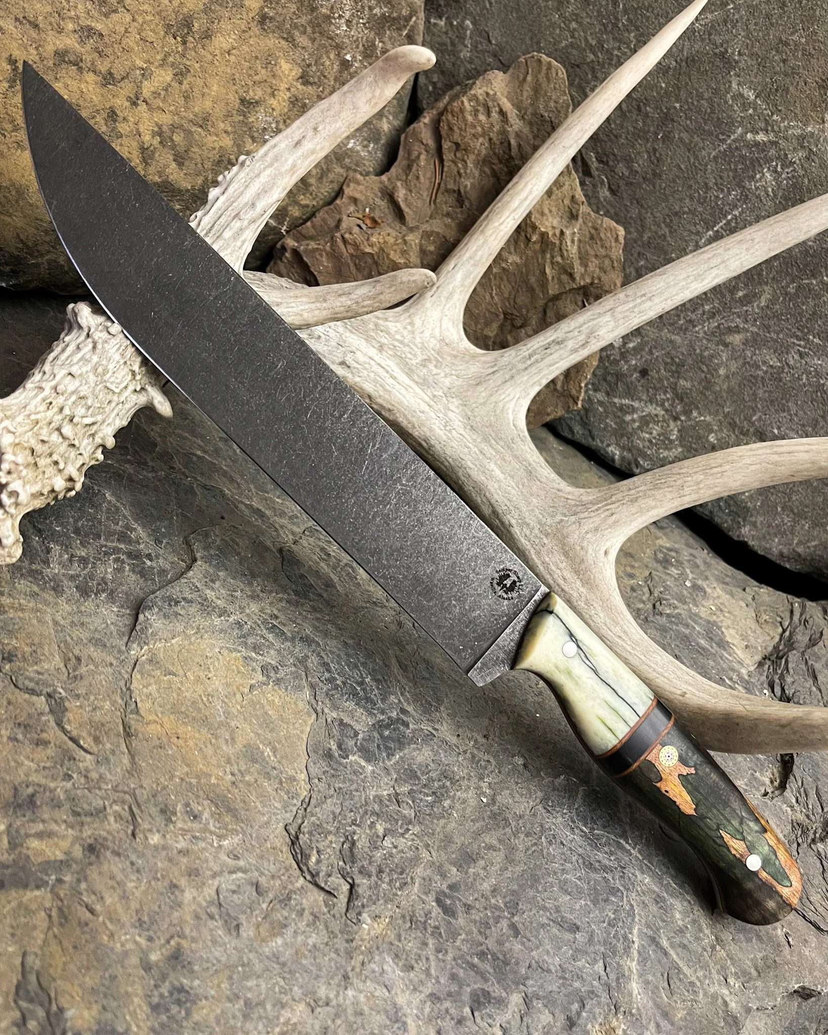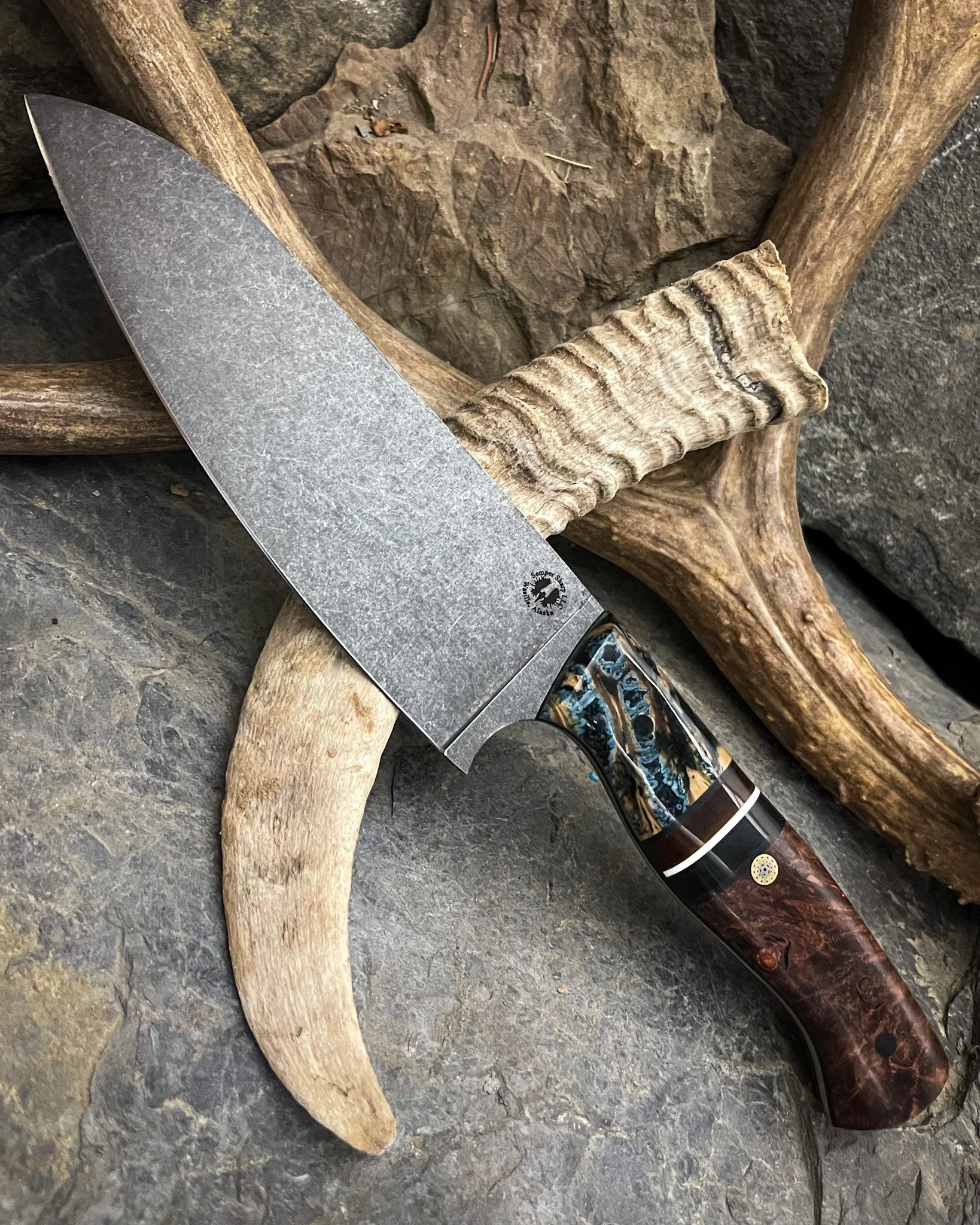 Kitchen knives differ from Hunting and Fishing knives in that they are used daily. We use Swedish Stainless Steel for all of our kitchen knives. After experimenting with many different types and variations of steels and we have landed on AEBL and Nitro V for all of our kitchen knives. This steel has a very fine grain structure which allows for a razor-sharp edge. We use digital kilns for our heat treat. All of our kitchen knives have been tempered in liquid nitrogen for added edge retention and stain-fighting abilities.